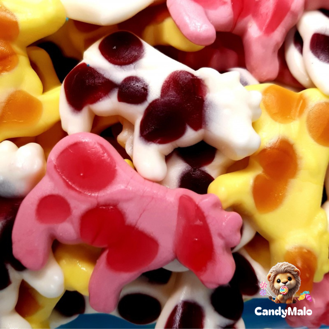Sirop de glucose, sucre, lait écrémé en poudre (6%), gélatine,Acidifiants : acide citrique et acide lactique, Gélifiant : pectine, arômes, Colorants : E104, E120, E124, E150c, E151, huile végétale, Agent de démoulage : cire d'abeille, cire carnauba.
